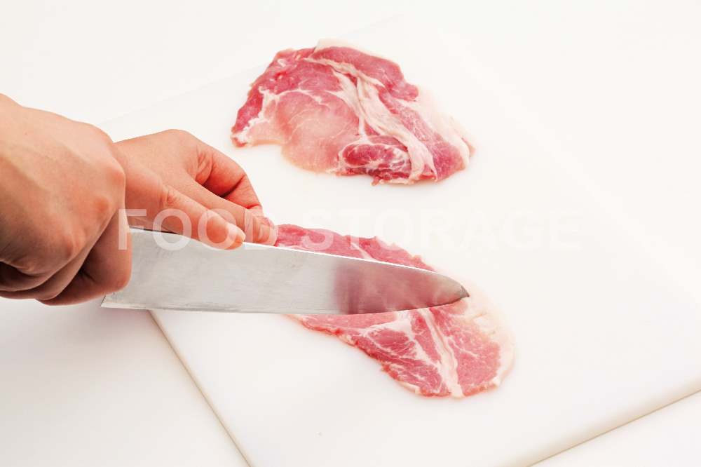 豚ロース肉は、脂身と赤身の間に包丁の先で切り込みを数か所入れ、すじ切りをする。 |