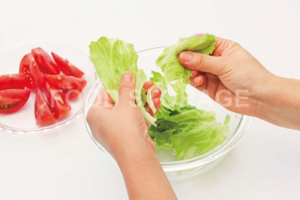 トマトはくし形切りにする。レタスは水煮5分ほど話してパリッとさせ、しっかり水けをきって大きめにちぎる。 |