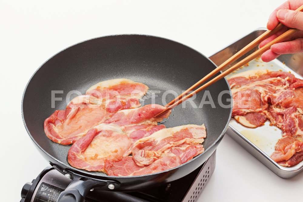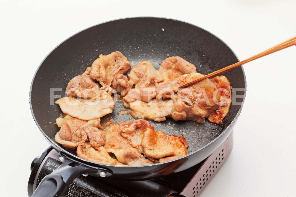 豚肉の周りがこんがりと焼けてきたら裏返し、中火で焼いて完全に火を通す。 |