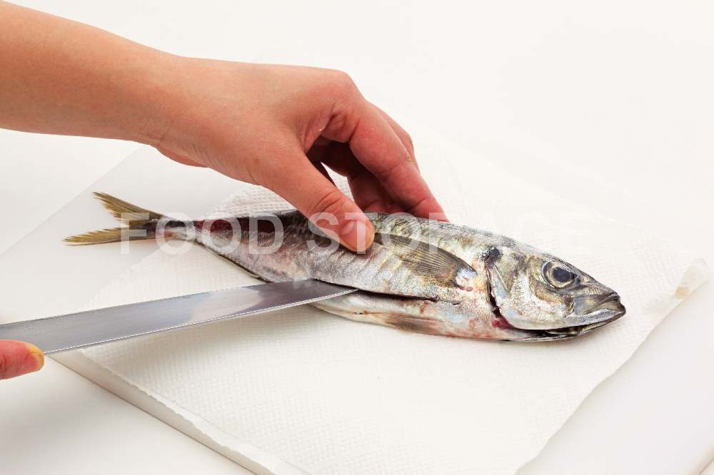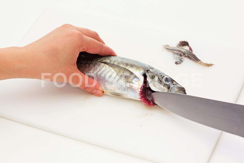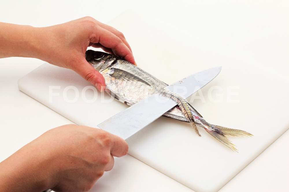 盛った時に裏側になる方の、胸びれの1㎝ほど下に5~6㎝の切り目を入れ、腹わたをかきだす。