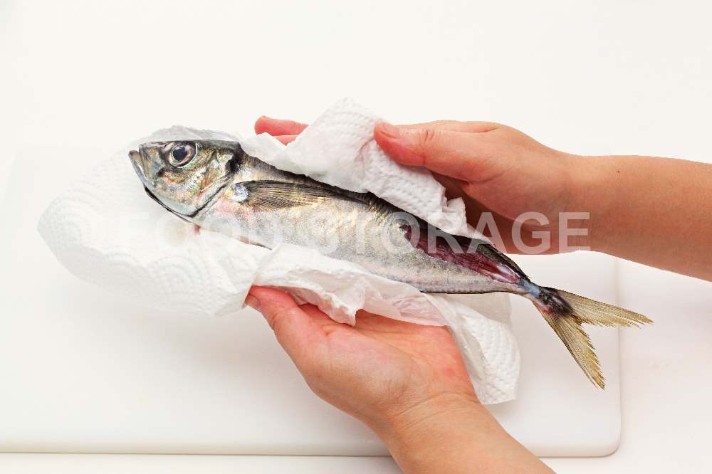 えらぶたの中や腹の中を、水できれいに洗い、しっかり水けをふく、両面に浅く十文字の切り込みを入れる。 |