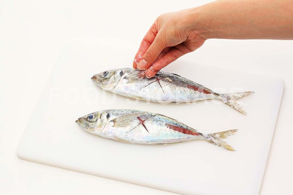 塩を多めにつまみ、両面に不利塩をして、ひれと尾にはとくにたっぷりとつける。 |