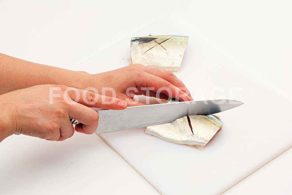 さばは皮に十文字の切り込みを入れて、まんべんなく塩をふって10分ほどおく。 |