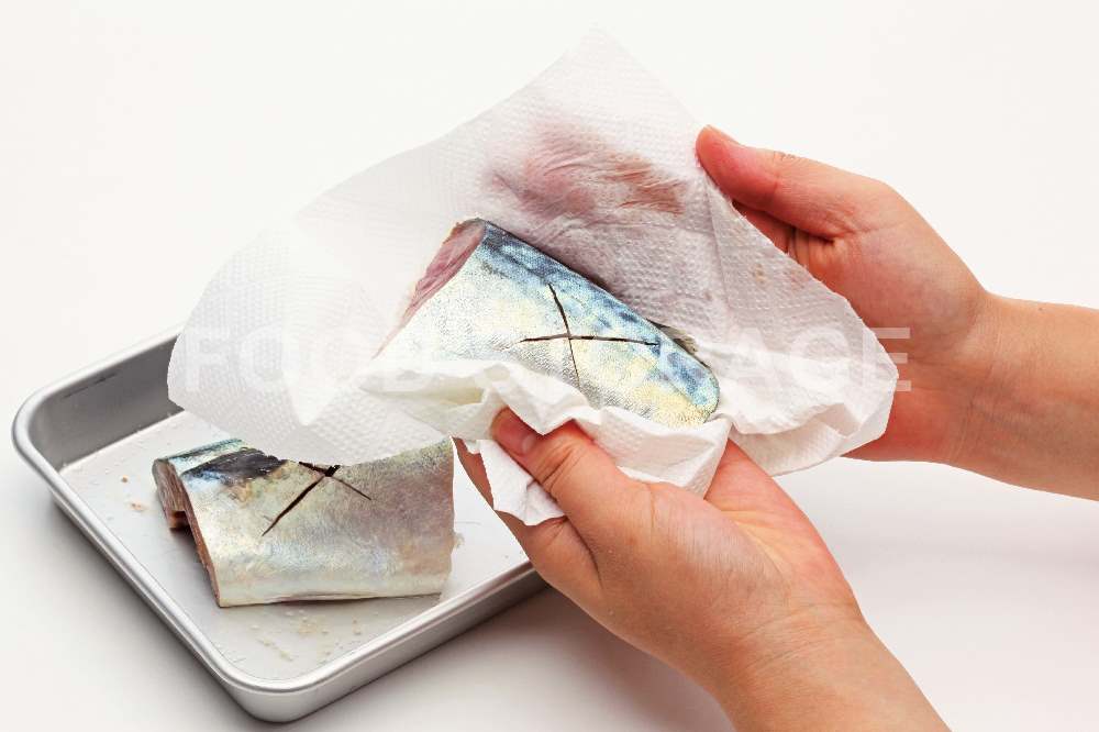 さばから出た水けをペーパータオルでふき取る。
