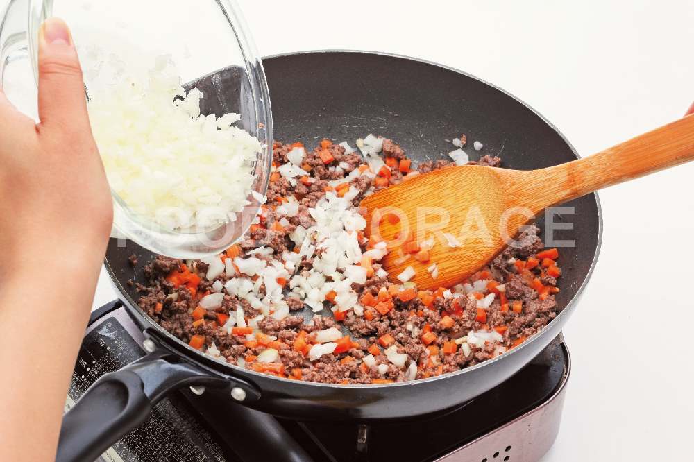 Point:にんじんは固いので、玉ねぎよりも細かく切る。 |