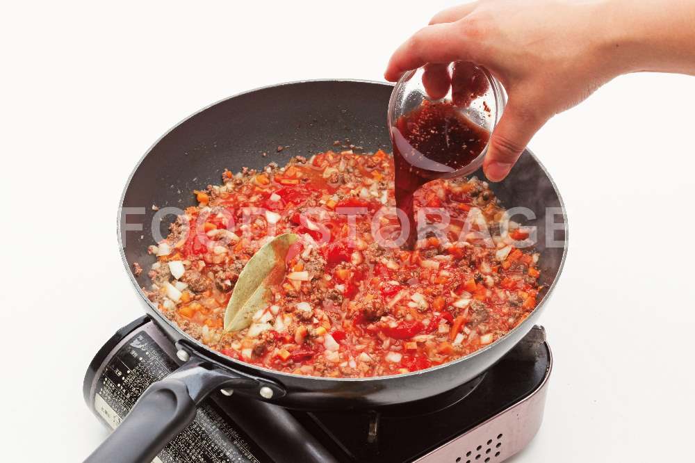 ホールトマト缶を缶汁ごと加え、さらにローリエ、Awo加えてトマトをつぶしながらよく混ぜる。煮立ったら弱火にし、ときどき混ぜながら煮る。