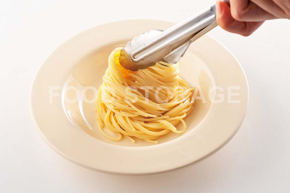 パスタをトングでつかみ、手首を返しながら円を描くようにこんもりと盛りつけると、バラバラにならずにバランスよく盛れる。 |