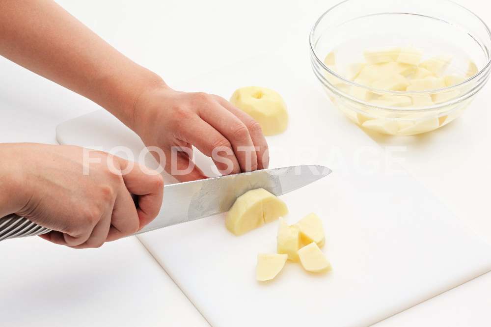 じゃがいもは皮をむき、ひと口大に切って水煮10分さらし、水けをきる。 |