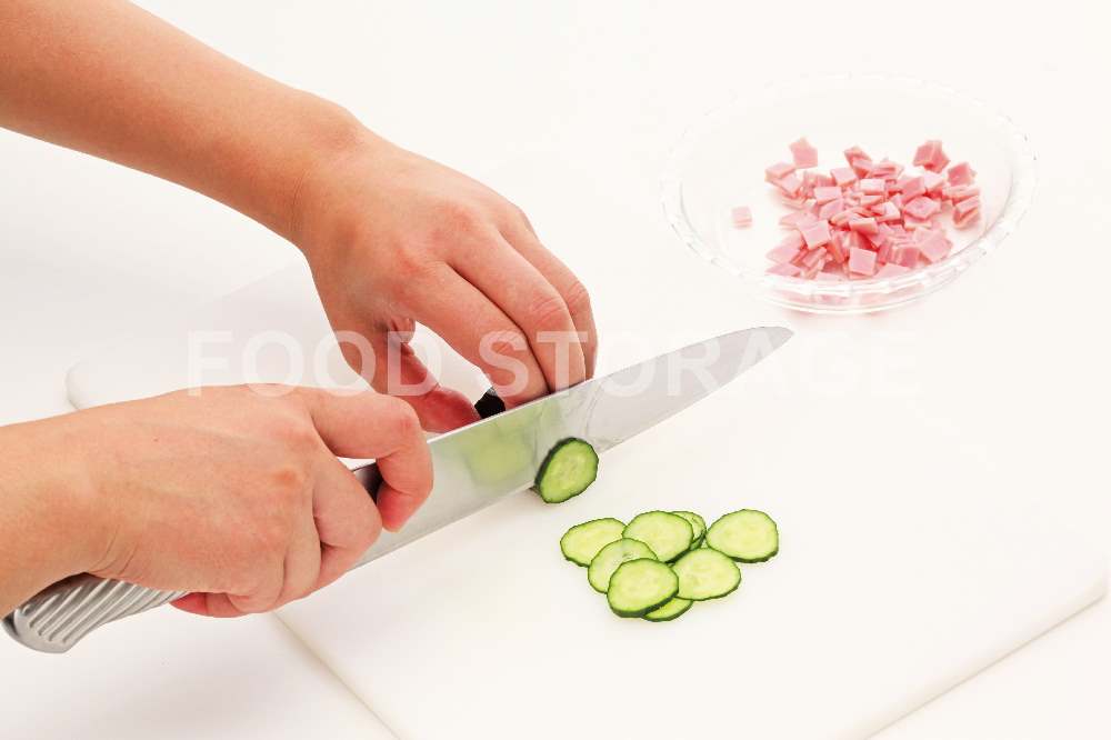 玉ねぎは縦に薄切りにし、水煮10分さらして水けをよくきる。ロースハムは1㎝角に切り、きゅうりは小口切りにして塩を振ってもみ、水気を絞る。 |
