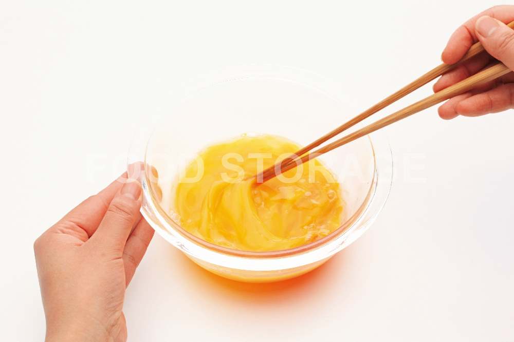 卵は小鉢に割ってカラザを取り除いてからボウルにうつす。菜箸で卵白を切るようにして溶きほぐす。