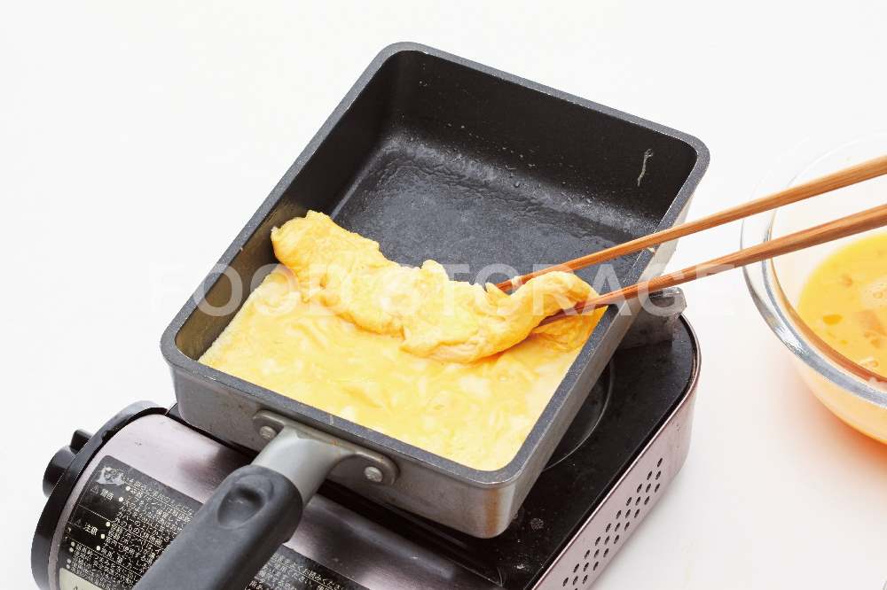 卵や危機に②の卵液の1/4量を流し入れて全体に広げる。卵が半熟状態になった田、卵や危機の奥を少し持ち上げ、奥から手前に向けて巻く。 |