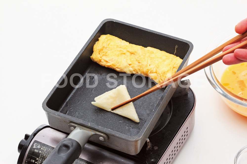 奥の空いた部分にサラダ油を薄くひき、まいた卵を奥にうつし、手前の空いた部分にサラダ油を薄くひく。 |