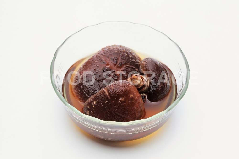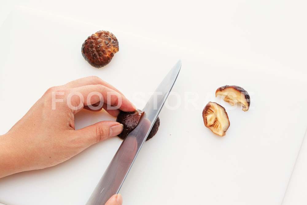 干ししいたけの軸を切り落とし、斜め半分に切る。戻し汁にだし汁を足して250mlにする。 |