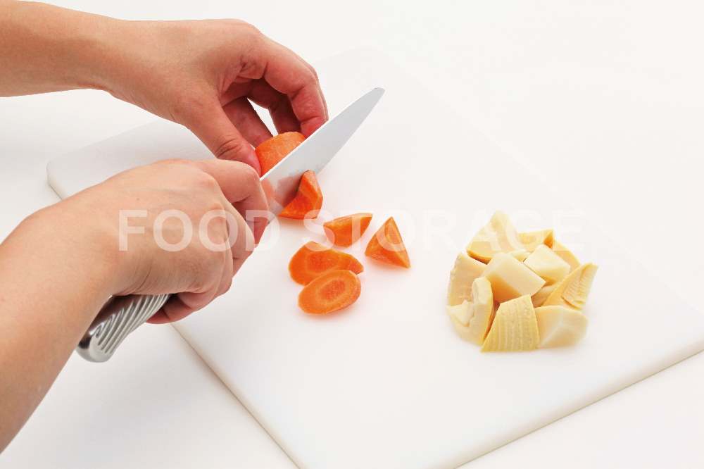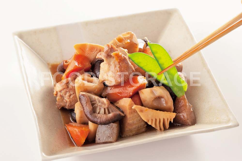 鶏もも肉は余分な脂と筋を取り除き、ひと口大に切る。にんじんは皮をむき、ゆでたけのこといっしょに、食べやすい大きさの乱切りにする。 |