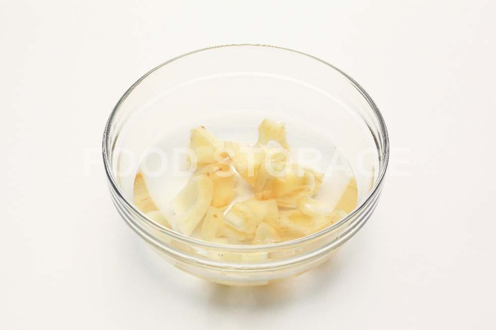れんこんは皮をむいて乱切りにし、酢少々(分量外)を加えた水煮さらしてアク抜きをし、流水でさっと洗って、水気をきる。 |