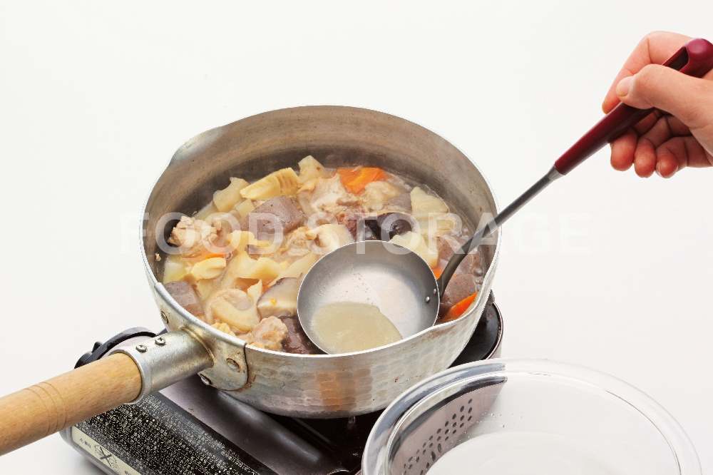 ②の戻し汁を加えて強火にし、煮立ったらアクを取り除いて中火にし、砂糖を加えて落としぶたをして煮る。 |
