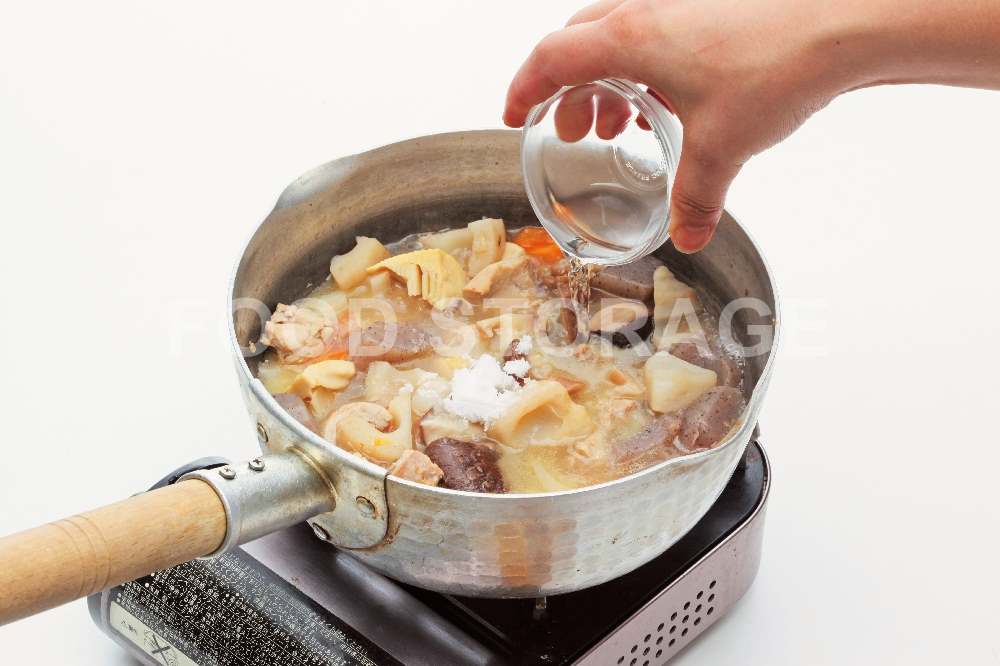鍋にサラダ油を熱し、③の鶏肉を炒め、焼き色がついたら③の野菜、④、⑤、②のしいたけを入れ、全体に油がまわるまで中火で炒める。 |