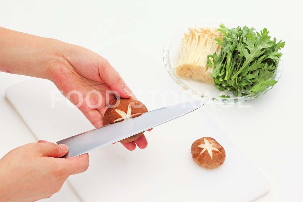 しいたけ、えのきだけは石づきを切り落とし、しいたけは飾り包丁を入れ、えのきは粗くほぐす。春菊は固い根元を切り落とし、半分の長さに切る。 |