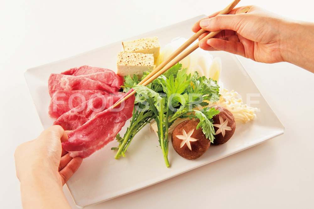 すき焼きを食卓で作りながら食べるときは、きれいにさらに盛り込むのもポイント。肉は広げて形を整えながら盛る。 |