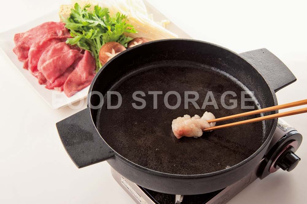 すき焼き鍋を強火にかけ、牛脂を入れて溶かし、鍋になじませる。