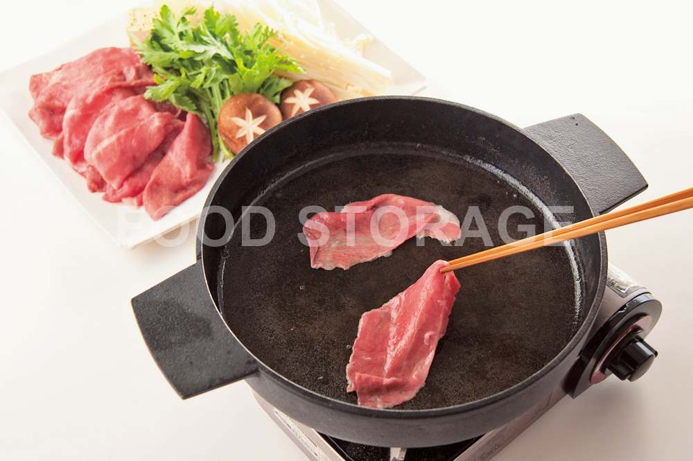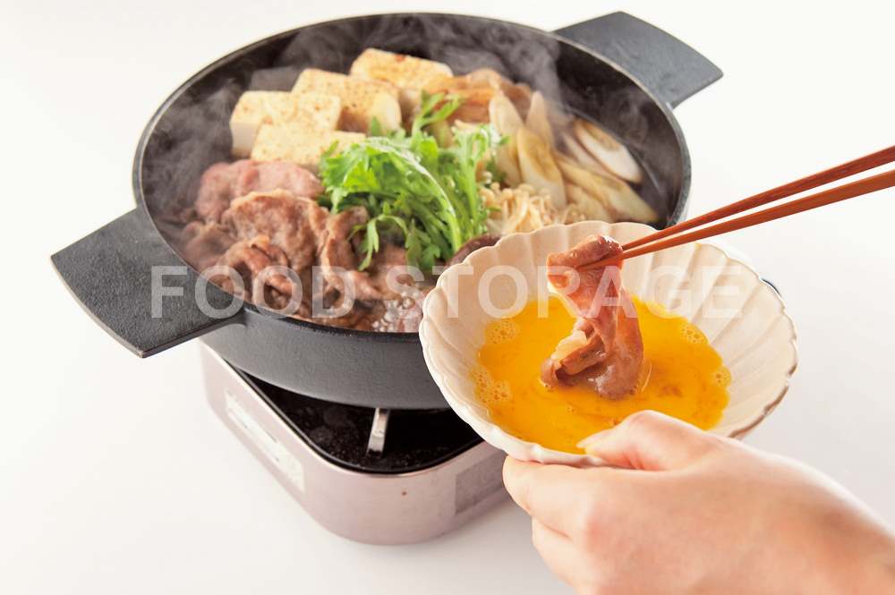 肉の色が変わったら器に卵を割りほぐして、つけながらいただく。ほかの材料も火が通ったら、同様にいただく。 |