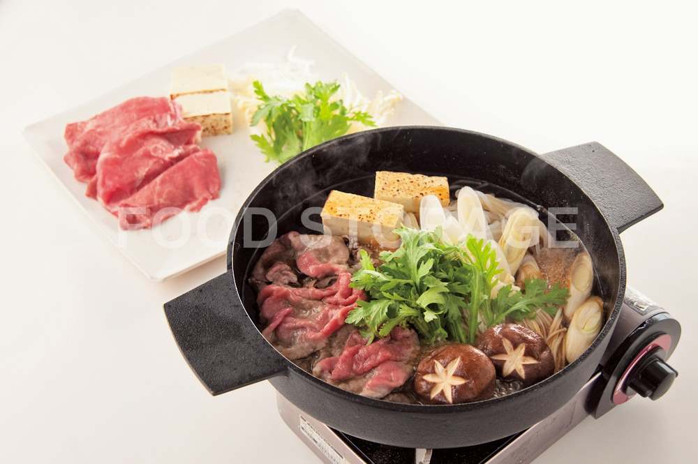 牛薄切り肉は大きければ半分に切る。長ねぎは1㎝厚さの斜め切り、焼き豆腐は4等分に切る。しらたきは自らゆでてアクを抜き、食べやすい長さに切る。 |