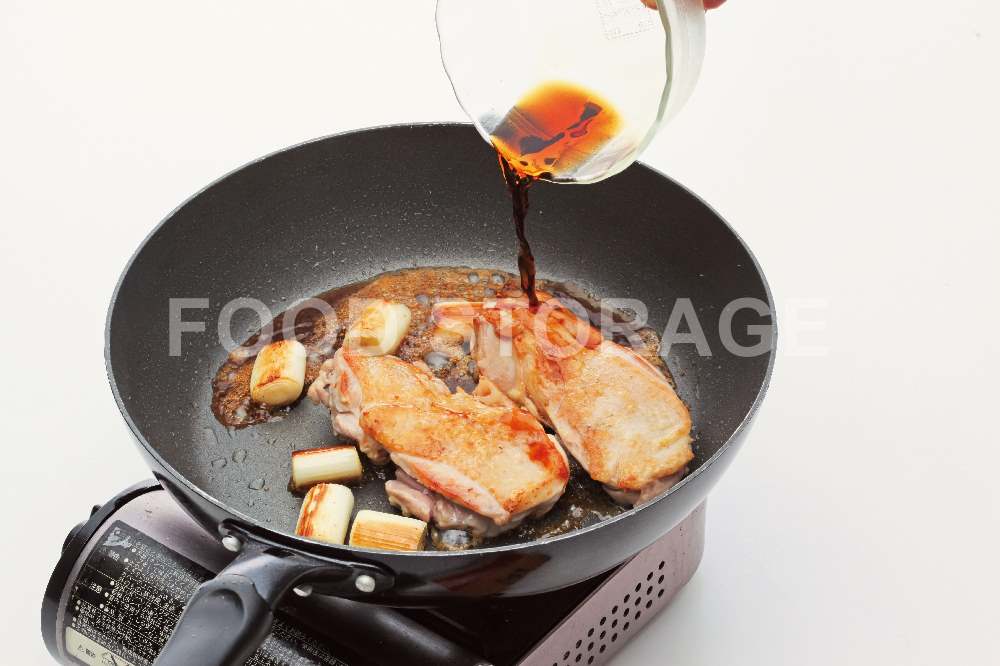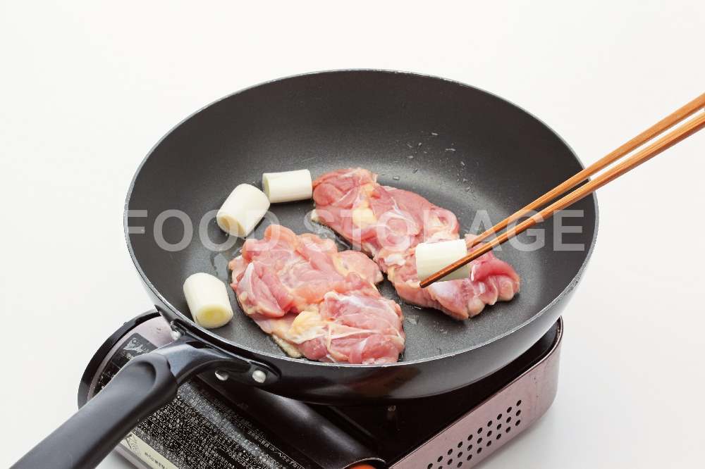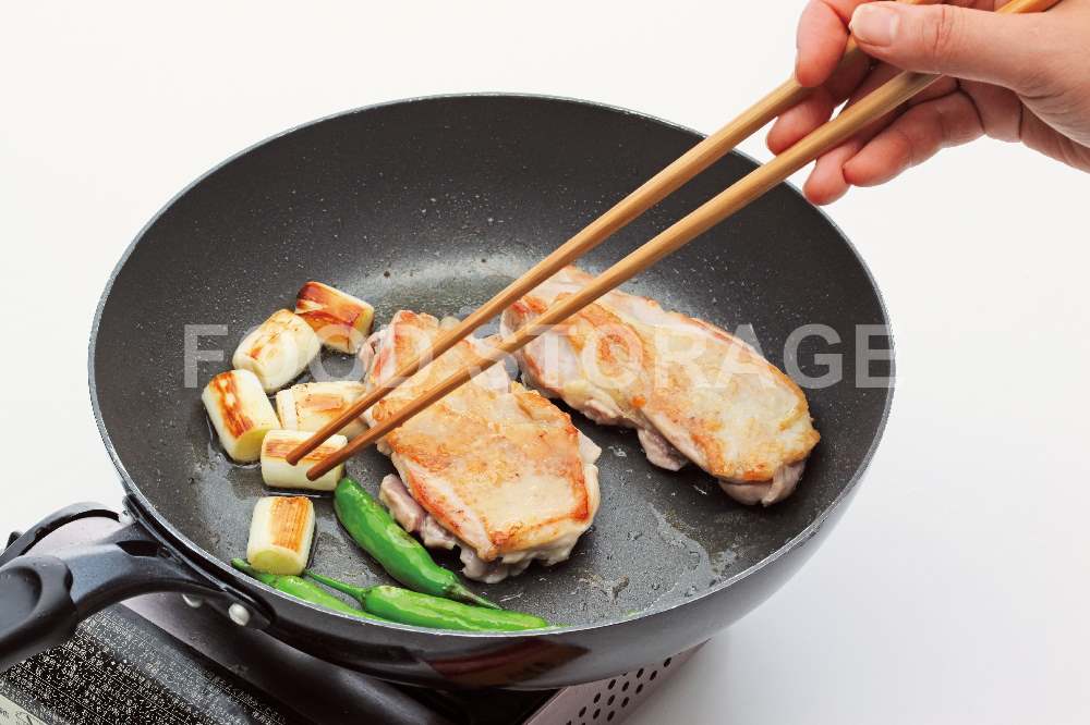 フッ素樹脂加工のフライパンを中火で熱し、鶏肉を皮目を下にして入れ、長ねぎも加えて焼く。