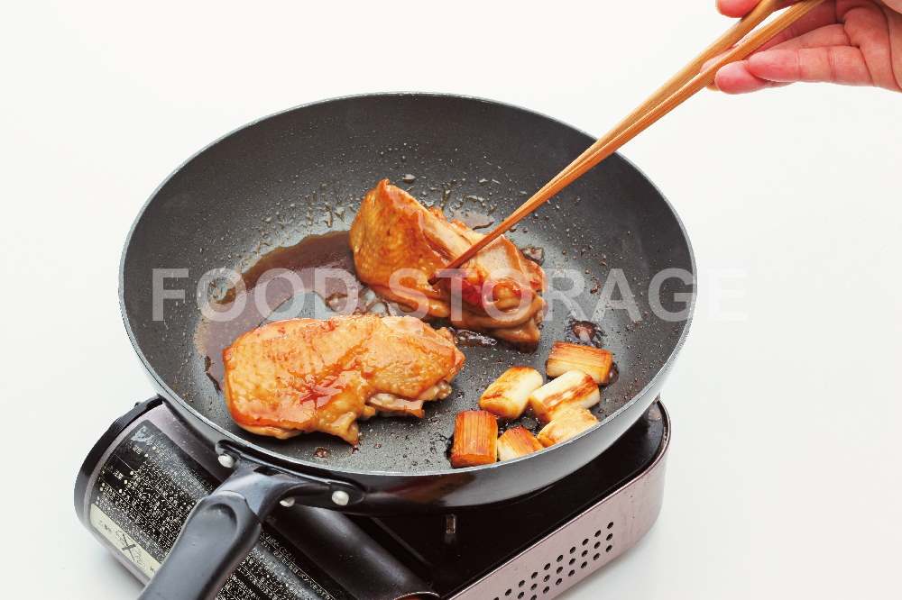 Point:油をひかず、鶏肉の皮をしっかり焼き、鶏肉から出た脂で焼く。 |