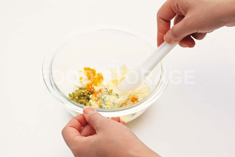 ゆで卵、ピクルス、パセリをすべてみじん切りにし、Bを加えて混ぜ合わせ、タルタルソースを作る。 |