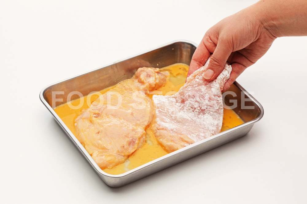 ④に小麦粉をまぶし、余分な粉を落としてから、溶き卵にくぐらせる。