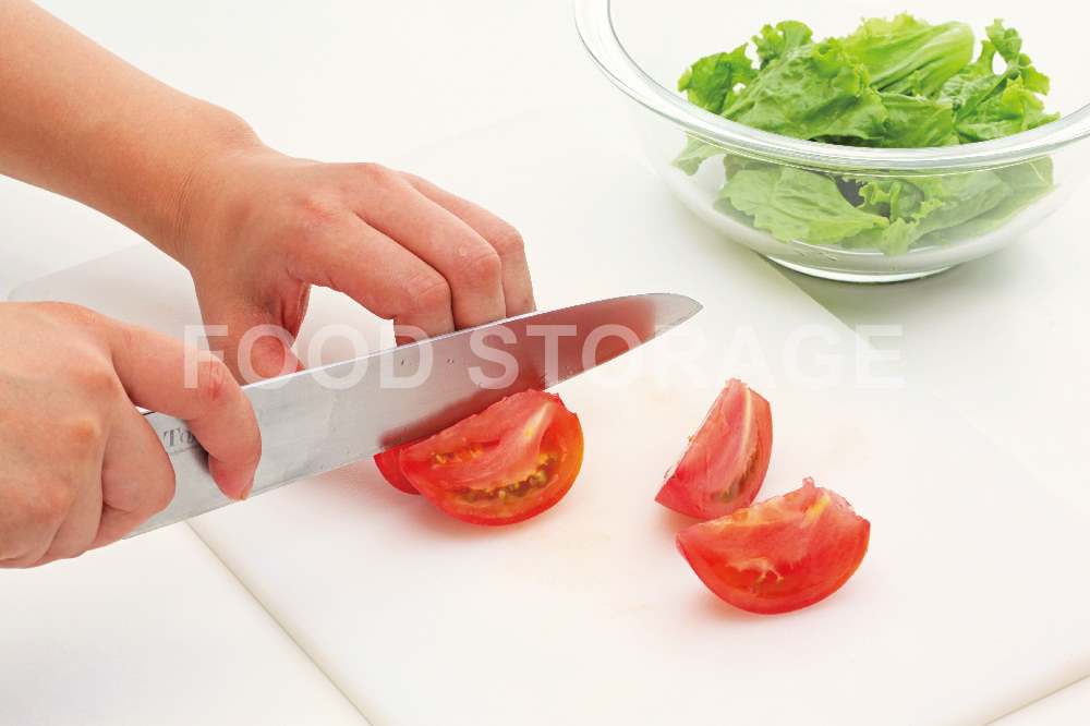 リーフレタスは洗って水けをふき取って、食べやすい大きさにちぎり、トマトはへたを取ってくし形に切る。 |