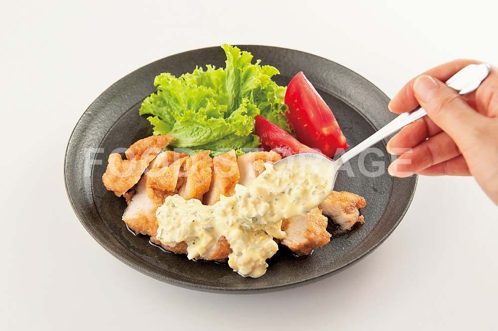 鶏肉の切り身をずらしながら盛り、タルタルソース前面にかけず、鶏肉の半分から手前のさらに少し落ちるようにかける。 |