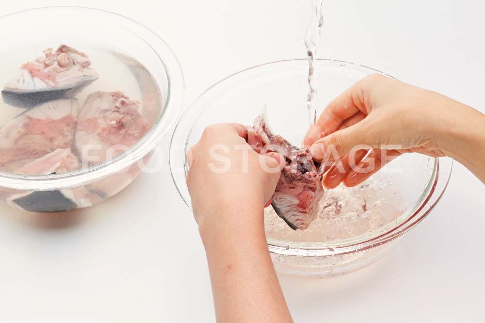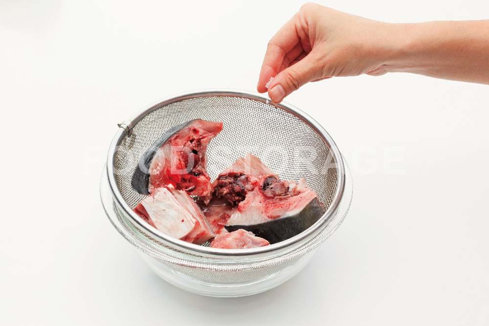 鍋にたっぷりの湯を沸かし、④をくぐらせて。身の表面が白くなったらすぐに冷水にとり、流水でうろこや血合いをていねいに粗いお年、水けをふく。 |
