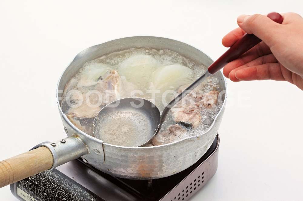鍋に③、⑤、①のしょうが、Aを入れて強火にかけ、煮立ったらアクをていねいにすくい取る。