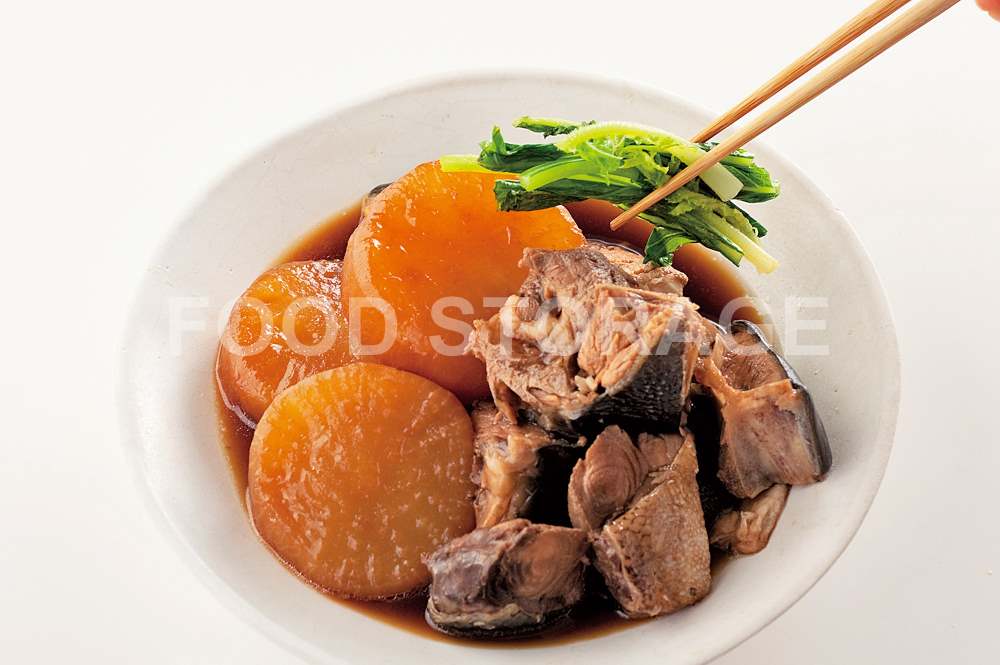 大根の葉(なければ小松菜などの青菜)を塩ゆでして盛りつけると、茶色いぶり大根にも彩りが出る。 |