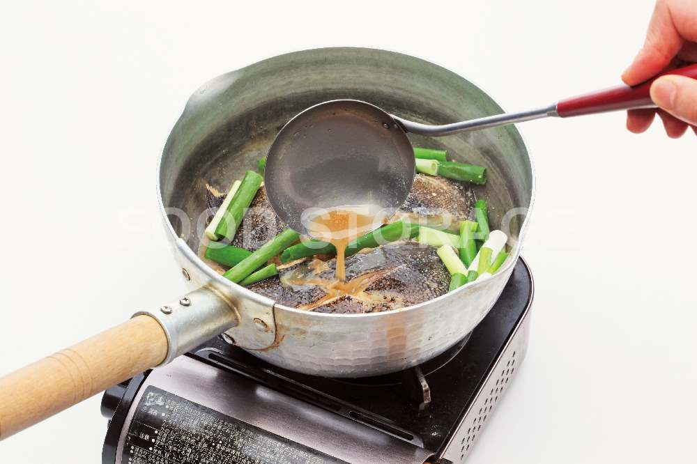 落としぶたを取ってわけぎを加え、強火にして煮汁をかれいにかけながら煮詰める。