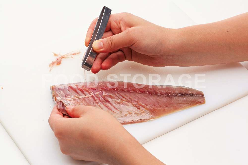 さばは小骨を骨抜きで取り除き、2㎝幅に切る。 |