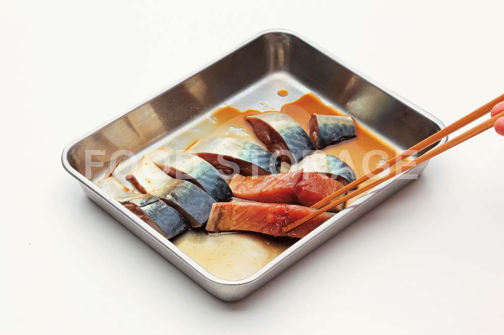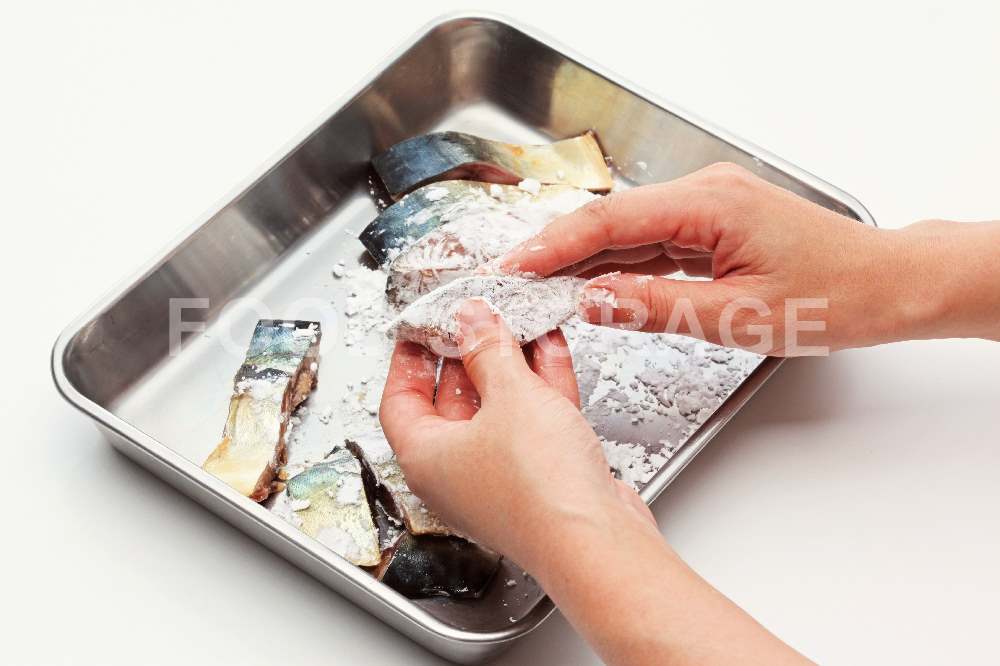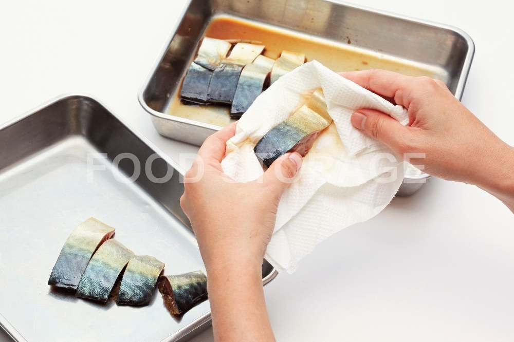 ②のさばの汁気をペーパータオルで軽くふき取る。 |