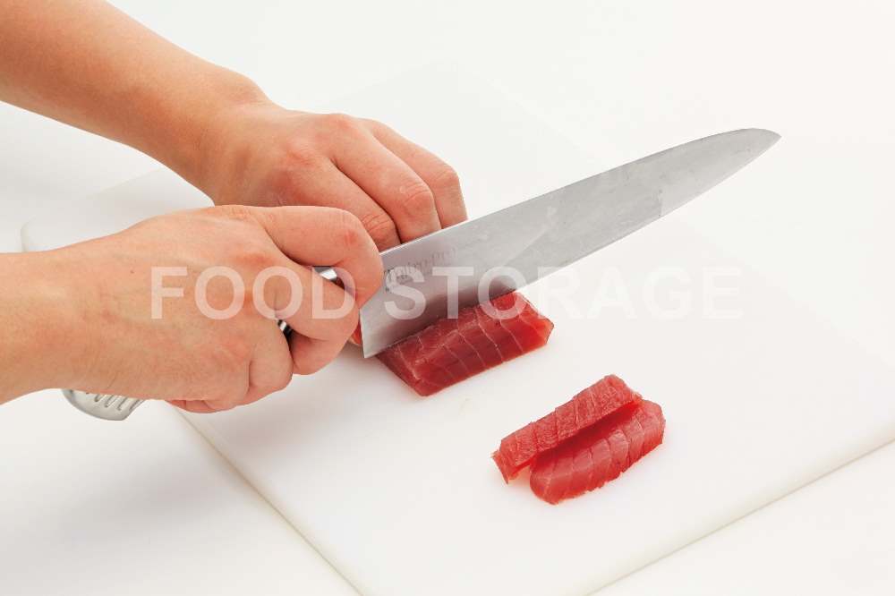 包丁の葉もとに近い部分をまぐろの端から1㎝幅の手前側にあて、左手を軽くまぐろに添えておさえる。 |