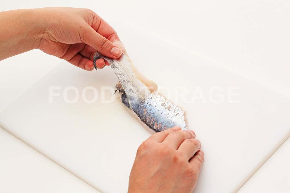 あじは腹骨を切り取り、皮をむく。 |