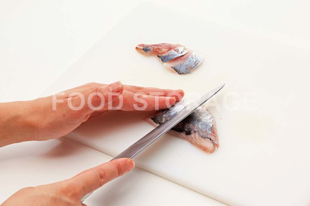 皮目を上にし、身の左端から包丁を倒して入れ、そのままの角度で手前に引きながら身をすくうように切る。 |