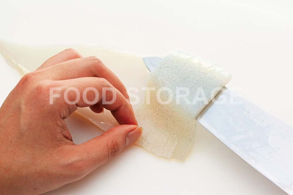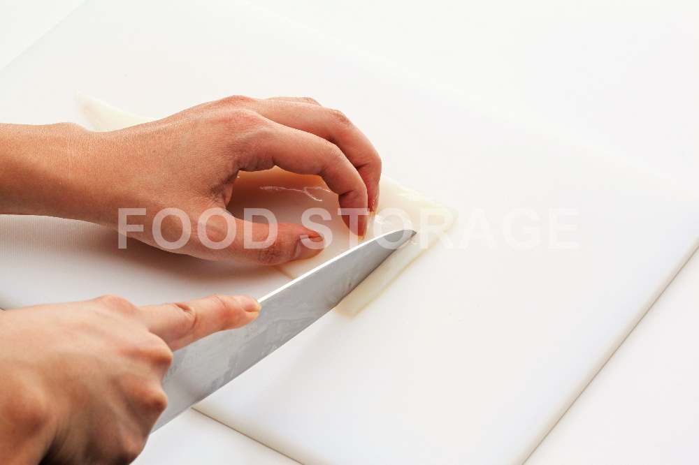 いかは横長に置き、包丁の先をすっと手前から引きながら、右端から細く切る。 |
