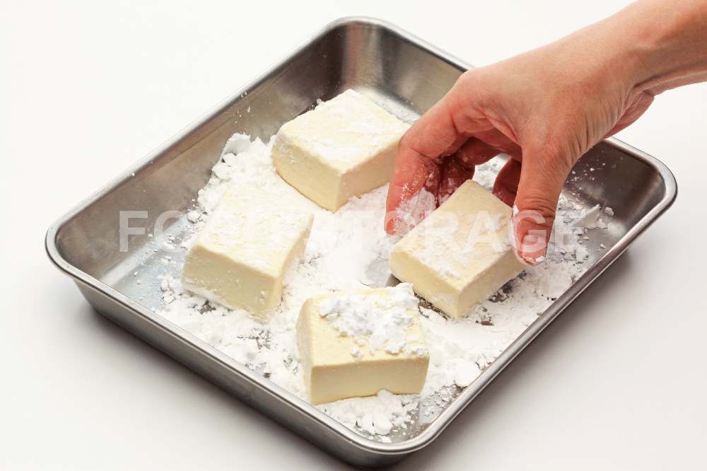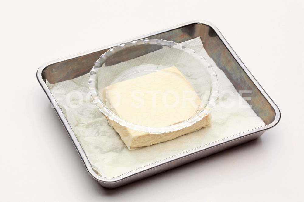 絹ごし豆腐はペーパータオルに包んで皿などで重い詩をして10分ほど水切りをして4等分に切る。 |