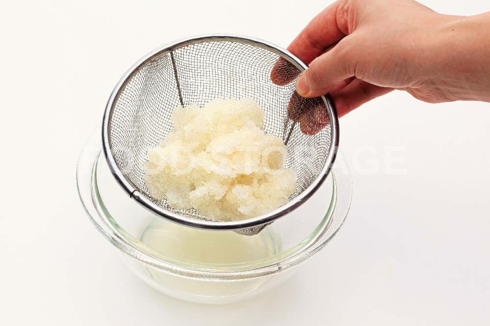 大根はすりおろして、ざるに上げて軽く水けを絞り、しょうがは皮をむいてすりおろし、万能ねぎは小口切りにする。 |