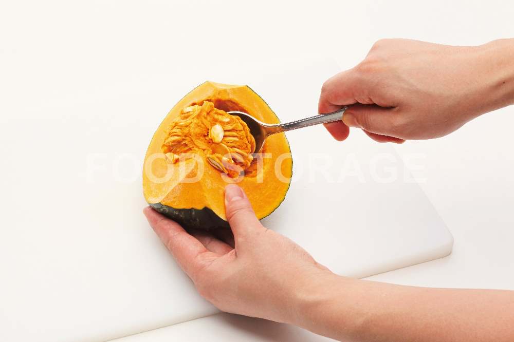 かぼちゃはわたと種をスプーンできれいに取り除く。 |