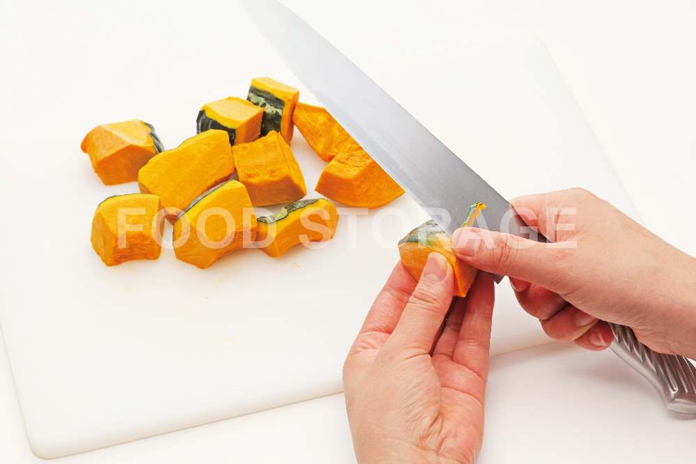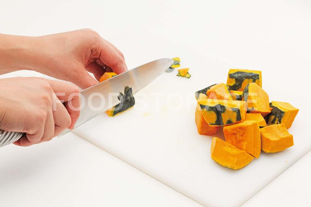 ①を4cm角に切る。固いので左手でかぼちゃをしっかり押さえて切る。 |