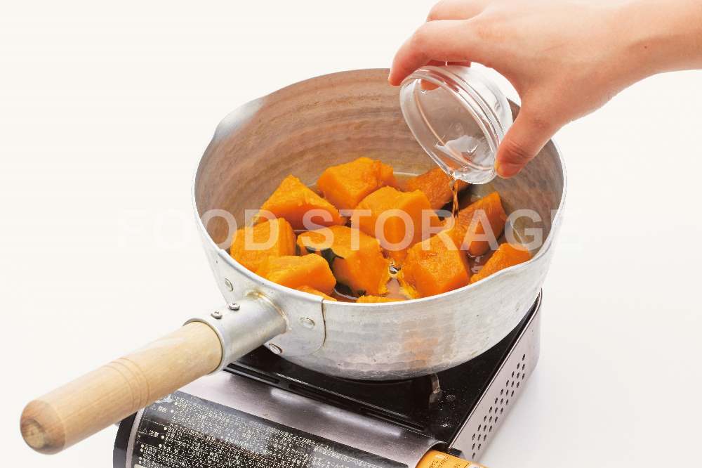 かぼちゃが柔らかくなったら落としぶたをはずし、みりんを回しかけて強火にし、30秒ほど煮る。