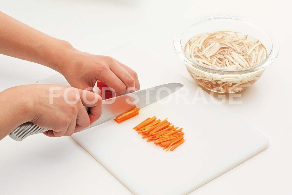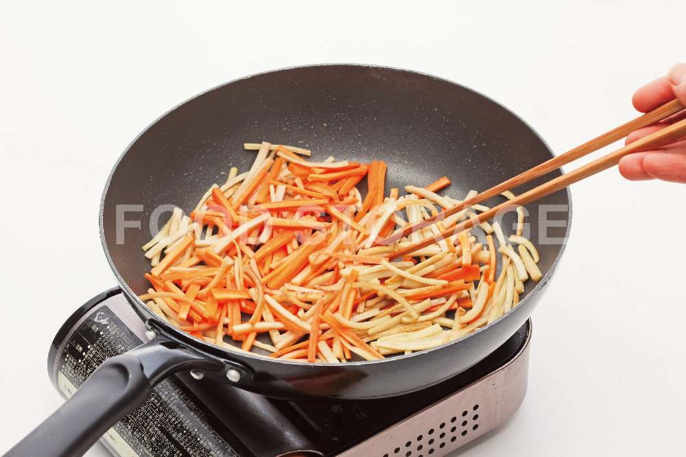 にんじんは皮をむいて、ごぼうと同様の大きさの細切りにする。 |