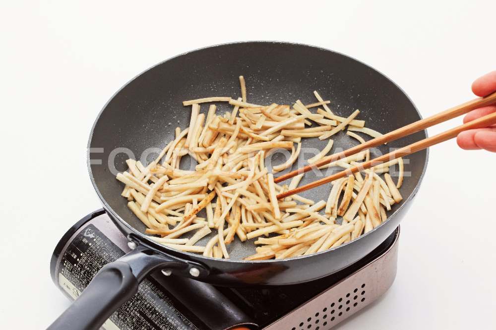 ごぼうは包丁の背で皮をこそげ、4cm長さに切って、細切りにする。酢少々(分量)を入れた水に浸けてアクを抜く。 |
