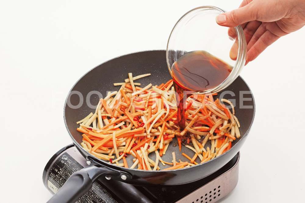 Aと赤唐辛子を加えて汁けがなくなるまで炒め煮にする。 |